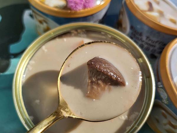這罐「黑松露菌菇濃湯」味道很濃,濃湯裡還有杏鮑菇與鷹嘴豆增加口感與滋味的豐富度。這次三種口味濃湯我最喜歡這罐!