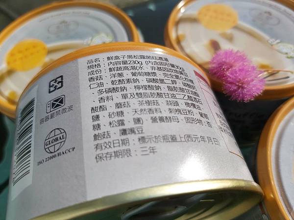 成份:鮮蔬高湯(水、豆漿(水、非基因改造黃豆)、香菇、洋蔥、奶精粉(葡萄糖漿、完全氫化棕櫚仁油、乾酪素鈉、磷酸氫二鉀、碳酸鈣、多磷酸鈉、檸檬酸鈉、脂肪酸甘油酯、香料、單及雙脂肪酸甘油二乙醯酒石酸酯)、蘑菇、茶樹菇、蒜頭、橄欖油、鹽、砂糖、松露調味粉(天然香料、刺槐豆粉、葡萄糖、松露、鹽)、營養酵母、固形物:杏鮑菇、鷹嘴豆