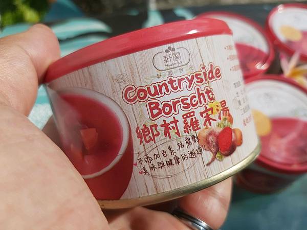 「鄉村羅宋湯」配合著內容物的甜菜根和紅蘿蔔等食材的顏色,罐頭主要採紅色系的圖案設計。