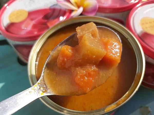 「南瓜堅果濃湯」的規格內容量是 230g,內含 50g 固形量包括:南瓜(口感柔軟的)與夏威夷豆(口感爽脆的) 。