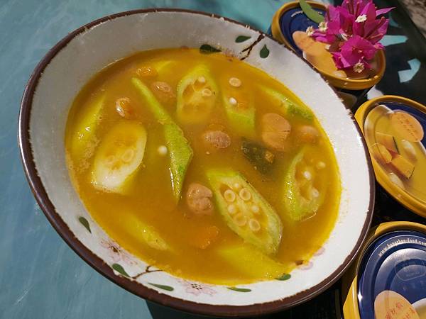 我將「南瓜堅果濃湯」用小鍋復熱後就滋味濃郁,再煮入當天早上才從田裡現摘的秋葵做成 🎃「南瓜堅果秋葵蔬菜濃湯」。營養滿點。