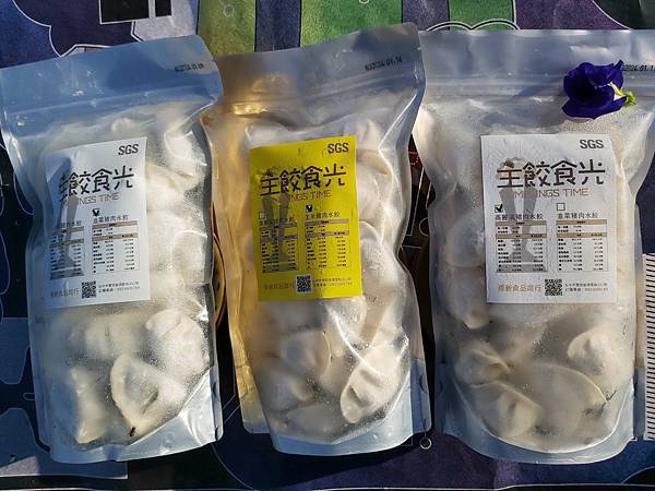 網購的「水餃」系列以部份透明的夾鏈袋包裝、每種水餃都有個討喜的名字譬如:「高高興興高麗菜水餃」、「金玉滿堂玉米豬肉餡水餃」和「長長久久韭菜豬肉水餃」。