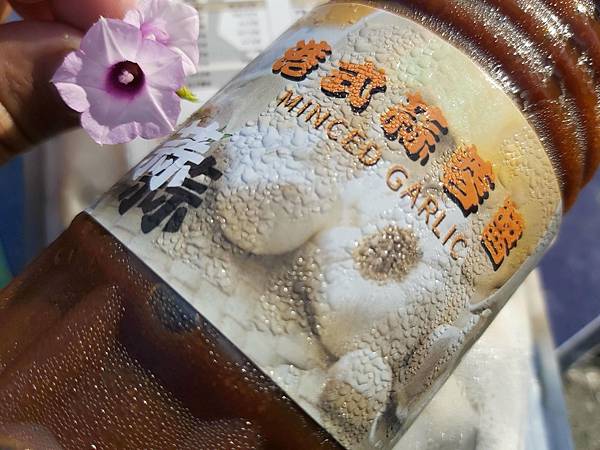 塑膠瓶裝的「港式蒜蓉醬」瓶裝重量 550g,成份只有蒜頭、醬油、蠔油與豬油,沒有添加化學調味劑與鮮味劑。就是要吃食材本味。