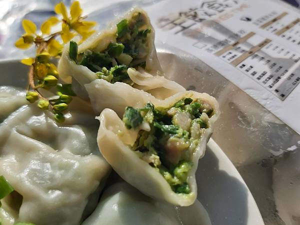 「長長久久韭菜豬肉水餃」的豬肉內餡量多豐滿韭菜香氣十足、水餃皮煮後也很有彈性,這個韭菜豬肉水餃味道鮮明好吃喔。