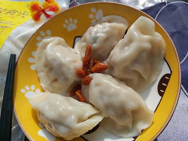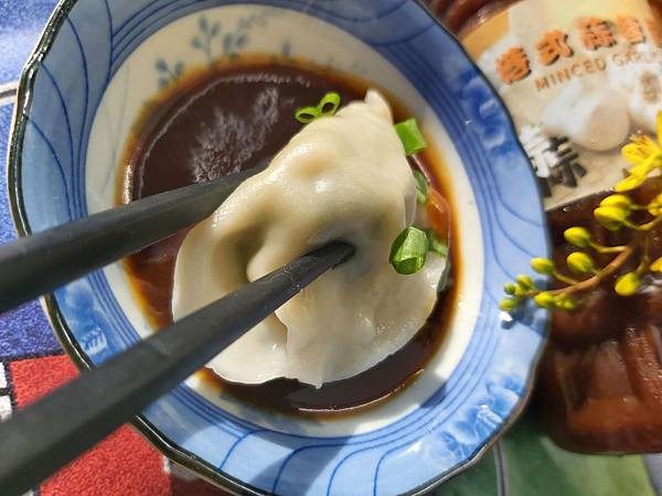 這「金玉滿堂玉米豬肉餡水餃」的味道鹹淡適中直接吃就很可以,再加點蒜蓉醬油則有著畫龍點睛的效果。我一次可以吃二十個吃不膩。