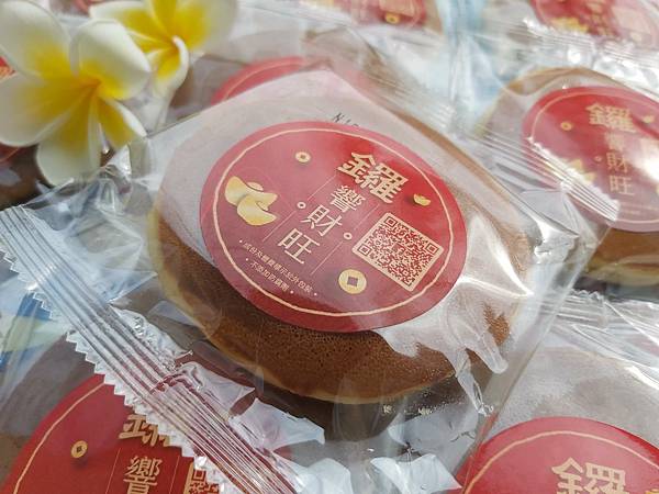 「黑糖紅豆銅鑼燒」是「鑼響財旺」的招牌甜點,獨立包裝上的貼紙有公版貼紙(鑼響財旺)還可以依需求製作客製化貼紙。