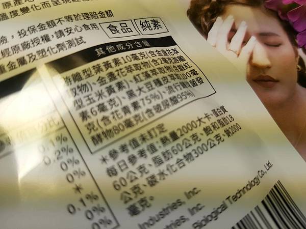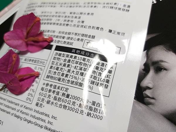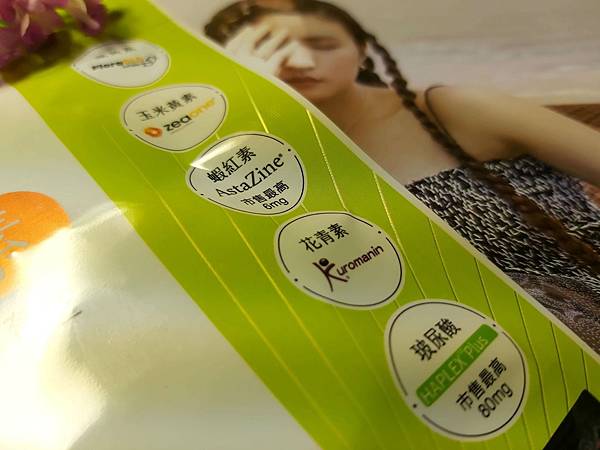 內容物成分:游離型葉黃素(含金盞花萃取物)、紅藻櫣取物(含蝦紅素)、金盞花萃取物(含游離型玉米黃素)、黃大豆種皮萃取(含花青素)】流行鏈球菌發酵物(含玻尿酸)