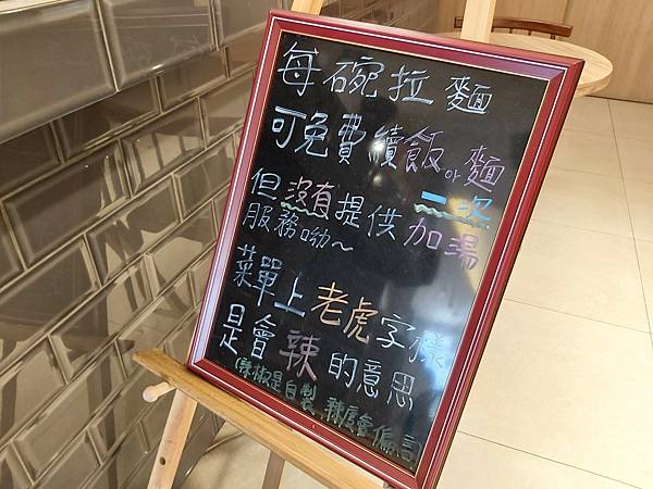 這家拉麵的口味一概都有普通與辣味兩種,菜單上寫有「老虎」兩字就是會辣。而且由於辣椒是店家自製、所以辣度會是比較辣的。每碗拉麵還都可免費續飯或麵一次。