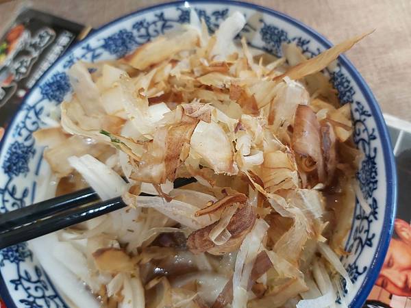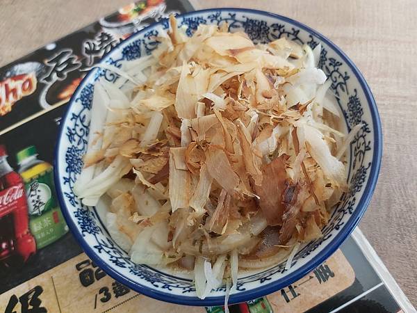 我們點了「和風洋蔥絲」以青花瓷碗送來,上頭鋪了好多柴魚片結果還看不到下頭的洋蔥絲呢。沒關係,我喜歡柴魚片所以不介意。
