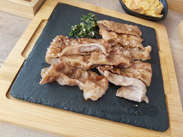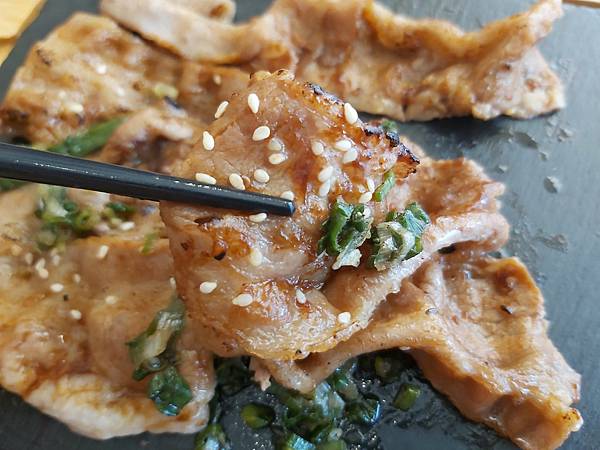 「蔥鹽炙燒牛五花」是朋友的追加餐點,使用黑色石板盛上「蔥鹽炙燒牛五花」。