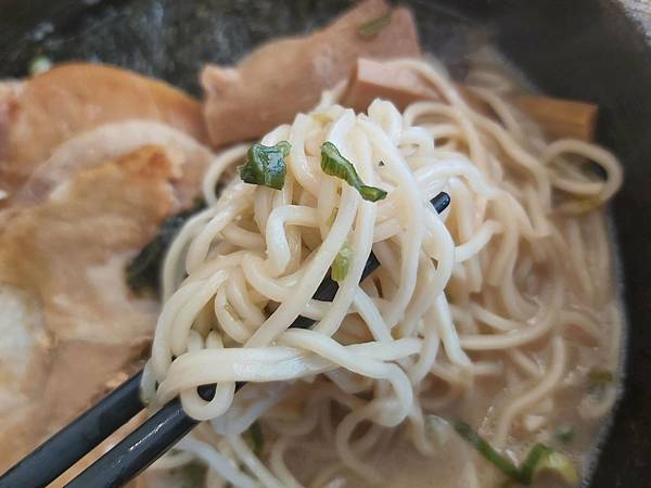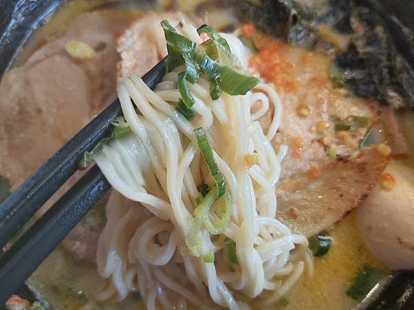 麵體使用的是細直拉麵、很容易巴上醬汁,朋友選了「多」的蔥花也很有加分效果。朋友很滿意他這碗麵,而且吃完就飽到不行了不用再加麵。嘿嘿。