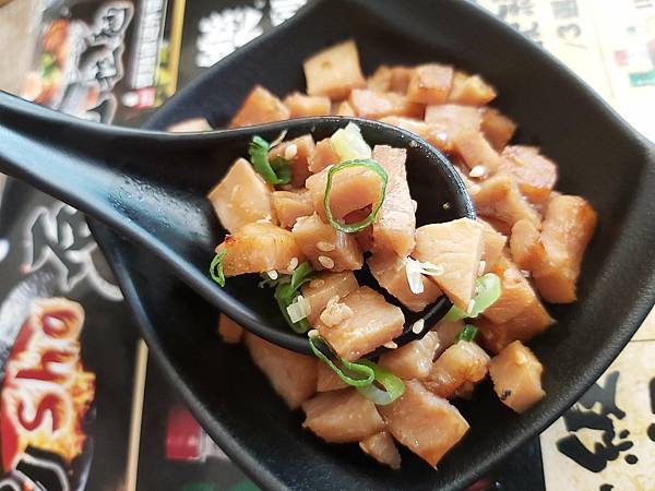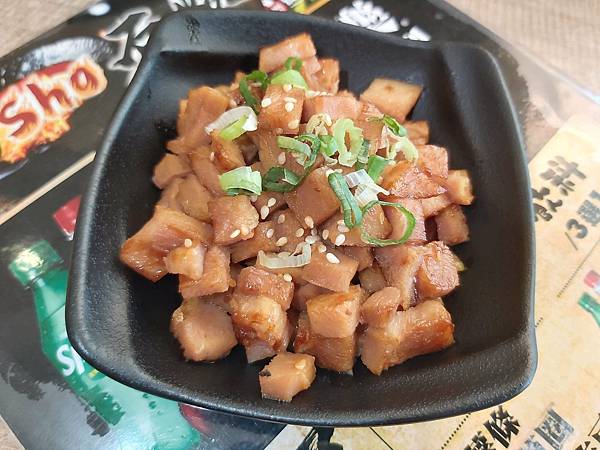 「日式醬烤叉燒丁」將醬烤的叉燒殅切成小方丁、上頭灑了蔥花和白芝麻點綴,賣相看起來就挺好的,吃起來富有口感與鮮滋味。