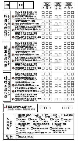 「究Sho石燒拉麵」的拉麵主要有「豚骨石燒拉麵」、「醬油石燒拉麵」與「味噌石燒拉麵」三大經典口味,還可以依個人口味選擇蔥花、辣度和湯頭。自由度不錯。