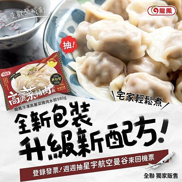 所以這回我用了禮券在我們公司斜對面的全聯購入「旗山龍鳳」新包裝上巿的「龍鳳冷凍高麗菜豬肉水餃」,以豬後腿肉及高麗菜做成的內餡風味十足、用來煮水餃或煎水餃都非常合適;我也登錄了滿額抽獎活動,希望過年可以抽中豪華的龍鳳大禮包什麼的多好。過年吃水餃增喜氣,紅起來!