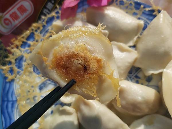 「冰花版煎水餃」,他們家以高筋麵粉揉製的水餃皮很適合做煎餃。