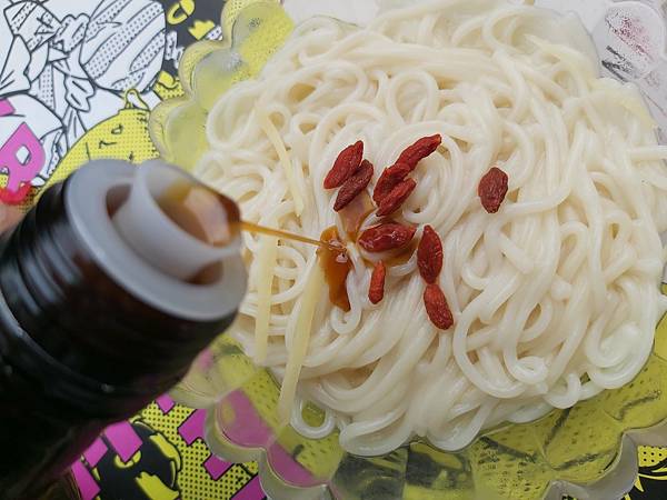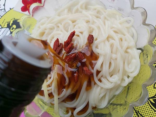我煮麵線時順便用了薑絲與枸杞、好了之後就迅速拌入「100%古法壓榨黑麻油」,因為麵線有自帶鹹味所以連調味都省下了。