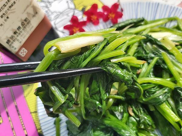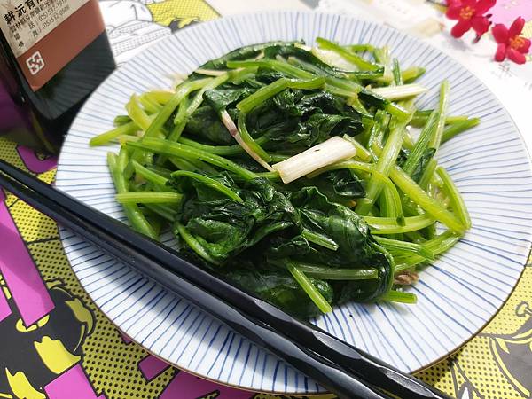 我拿「100%古法壓榨黑麻油」爆香蔥段和薑絲、再加入切成適口大小的菠菜,轉大火炒到菠菜熟了就可以上菜了。