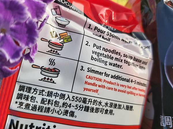 包裝上的建議煮法是以 550ml 的熱水加調味料與配料包煮麵、約煮 4~5 分鐘可以煮熟,倒是比較像台式傳統麵條了。