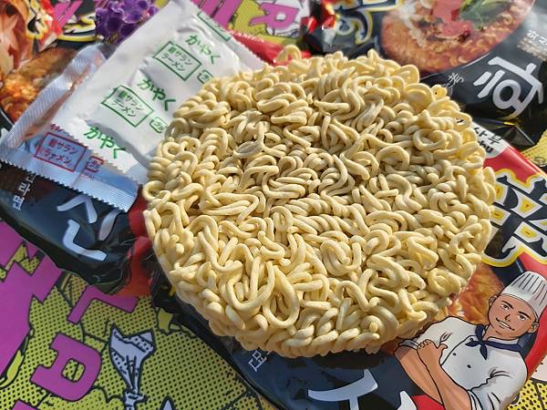 單包「韓式火辛拉麵」裡有圓餅狀泡麵、調料包與配料包,看就直覺曉得與台灣的泡麵煮法沒有太大差異。