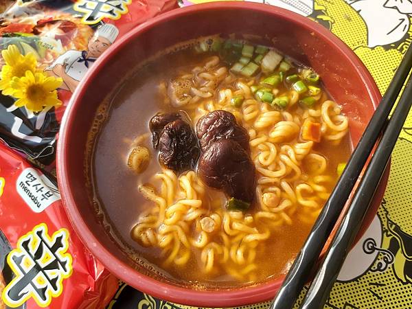 我將香菇連香菇水再加適量水煮滾後,放入「韓式火辛拉麵」麵體加入整包配料包;至於調味包因為看起來很紅很辣又很大包,所以我大概只用了十分之一的份量。我又不是我妹不用吃那麼辣!