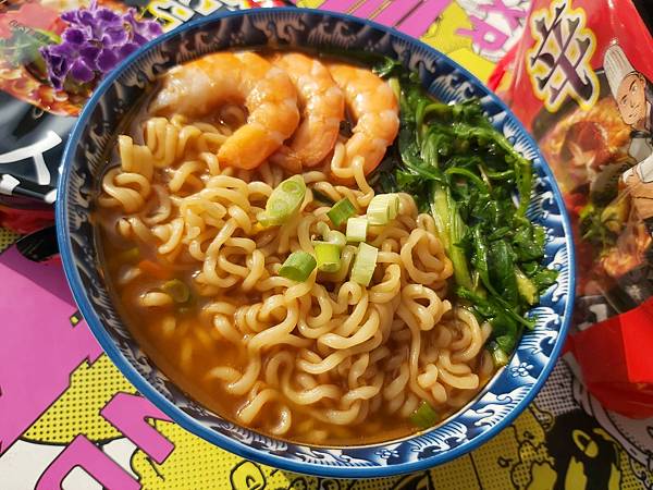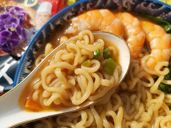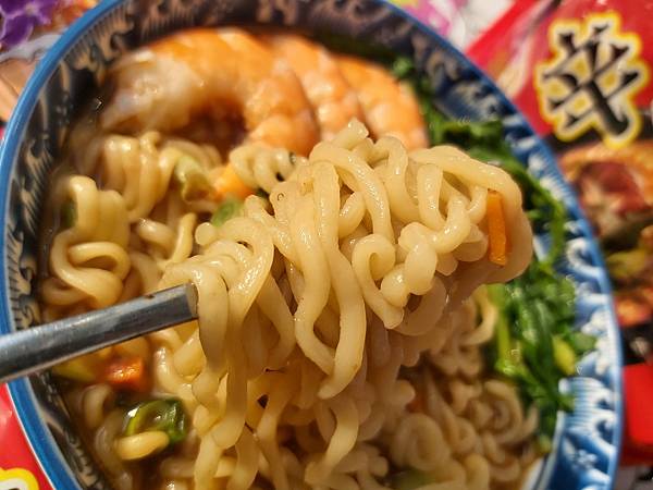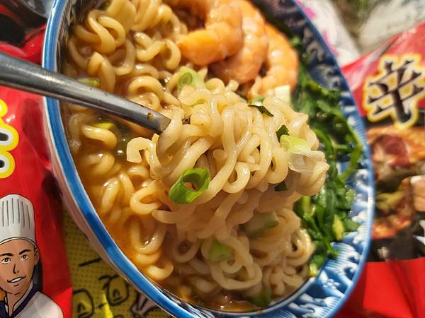 十分之一調味就足以煮出辣味濃郁、嚐得出韓式泡菜風情的拉麵,麵條具有彈性且久泡不爛,這碗鮮蝦泡麵的辣味很開胃、好吃到都可以直接端出去賣了!