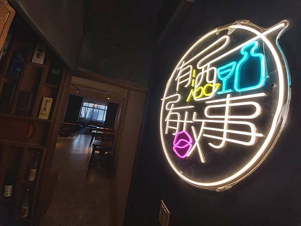 「艷食堂」除了一樓以二人、四人為主的位置之外,走上二樓還有更寬闊的空間,霓虹燈管寫著「有酒有故事」。一派餐酒館的氛圍。