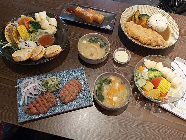 朋友與我經過半天的奔波後已經飢腸轆轆各自點了「鐵板煎牛舌佐軟法」與「厚切炸豬排咖哩飯」套餐,結果就送來一桌的餐點。很澎湃。這就吃起來。