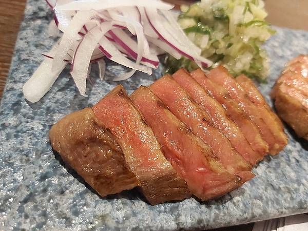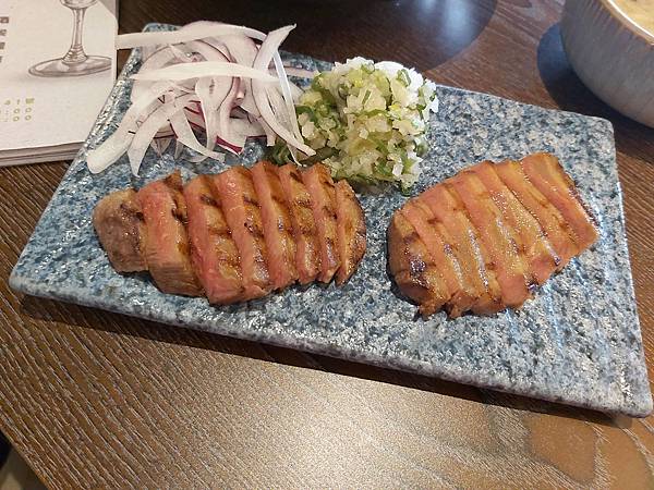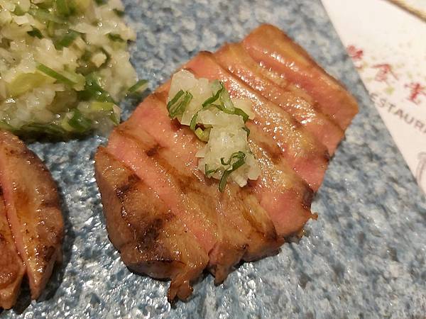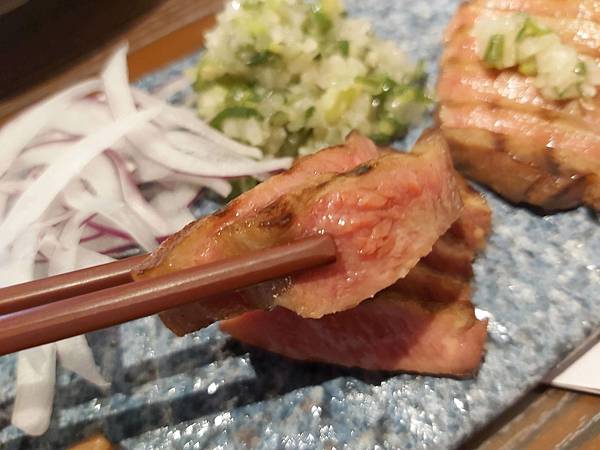 「鐵板煎牛舌」是以原塊紐西蘭牛肉香煎得粉嫩粉嫰的,看起來就很美味,還可以佐鹽蔥醬和紫洋蔥絲變化口味。