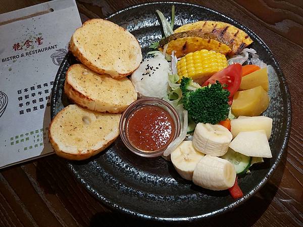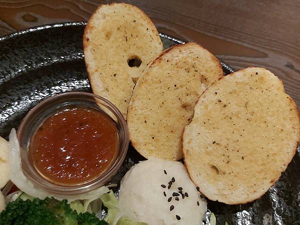 套餐均附「季節蔬菜水果沙拉」、選擇「鐵板煎牛舌佐軟法」套餐還加上軟法,一起盛在黑色陶盤送上顯得好豐盛!