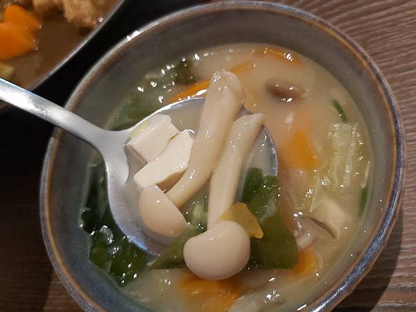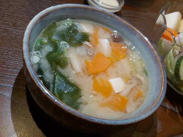 這天的「主廚例湯」是日式的海帶味噌湯,裡頭放了滿滿的都是蔬菜。