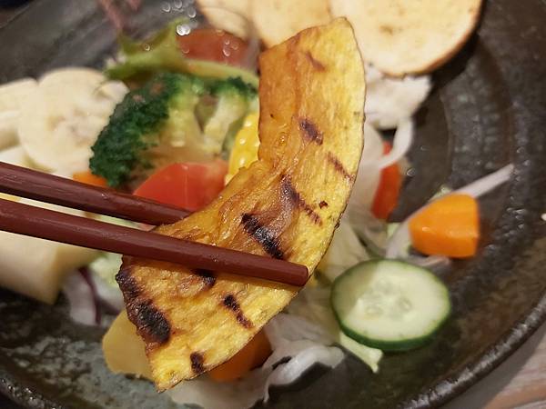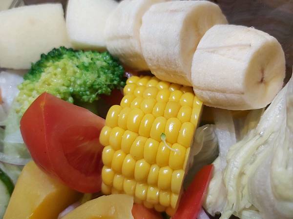 「季節蔬菜水果沙拉」內容則包括:青花菜、小黃瓜、紅蘿蔔、香蕉、烤南瓜、玉米、芋泥……等蔬果,種類多份量也多。