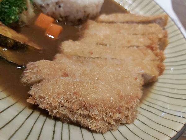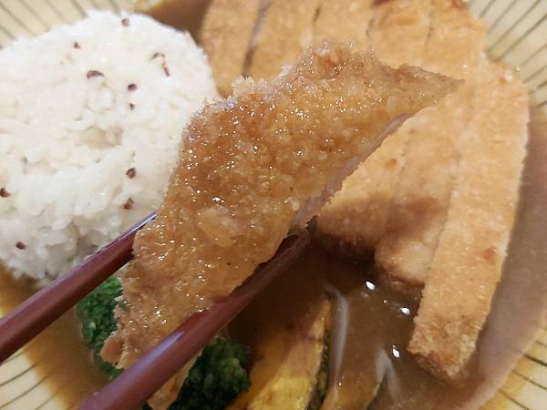 炸豬排的外皮炸得香酥、咬在口裡還有刷刷聲,將厚切里肌肉汁鎖在裡頭。表現不錯。