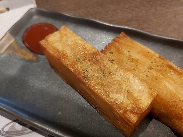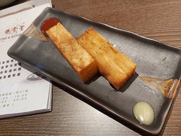 「招牌馬鈴薯千層」是店家的招待,搭配著紅、白兩種醬料以陶盤盛上。頗有禪意。
