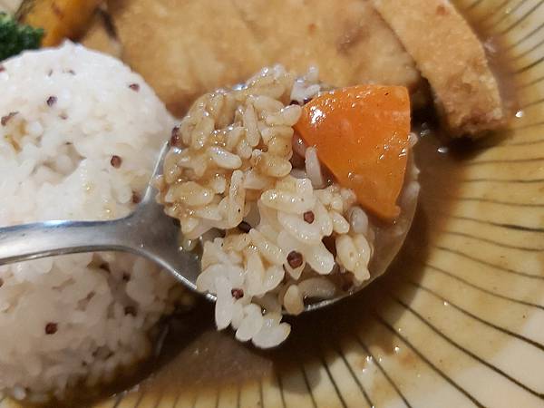 咖哩不會很辣、是大眾口味的咖哩,與炸豬排、紅蘿蔔與烤南瓜都很配,也很下飯。所以我把一整碗白飯都嗑完了,嘿嘿。