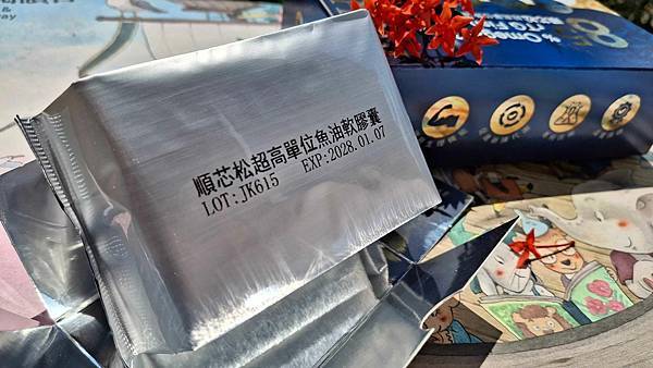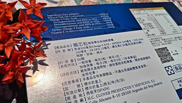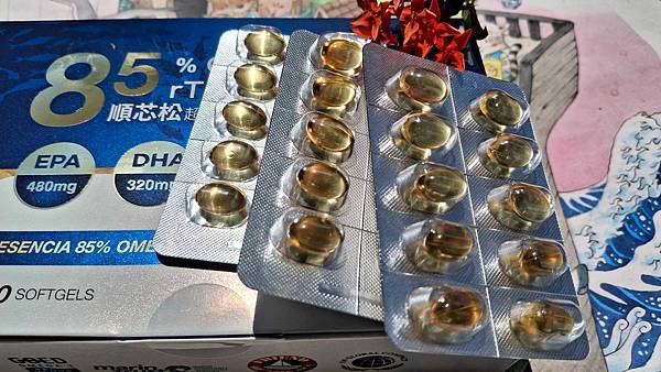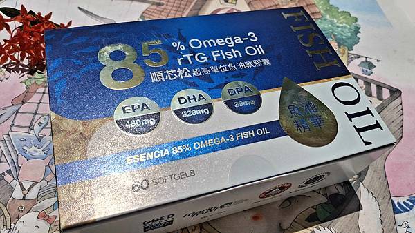 「順芯松超高單位魚油軟膠囊」是來自西班牙的頂級魚油,外包裝以藍、白兩色設計,很有地中海國家的風格。