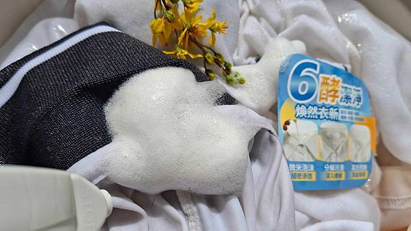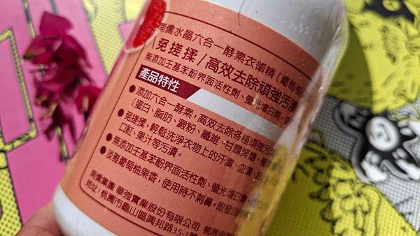 添加的「六合一酵素」包括:蛋白、脂肪、澱粉、纖維、甘露聚糖與植物酵素,特色在於能高效去除各種汙漬。