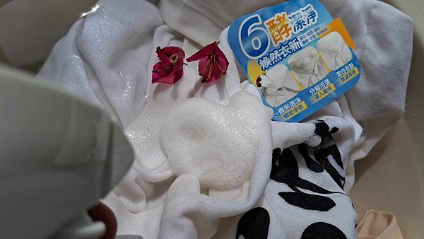 微米的潔淨泡沫噴好後只要等就好,可以免搓揉。噴、浸、洗,用水沖洗後當天留下的汙漬都變乾淨了。質地溫和不傷我的纖纖玉手,我喜歡。噗噗。