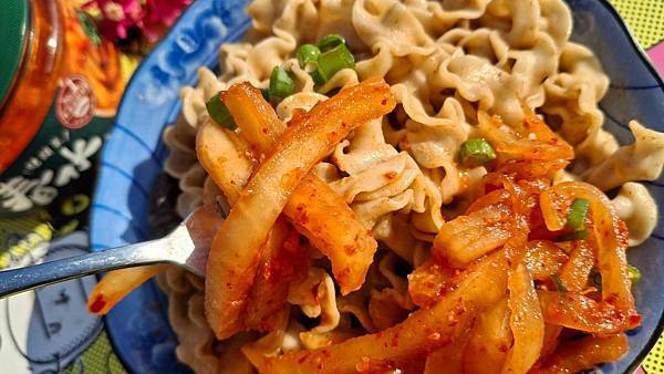 「春水招牌辣醬結頭菜」的結頭菜絲結合了蒜味與辣味辛香滋味、非常入味,配飯配麵做為配菜很能促進食欲。我都忍不住抱怨一罐只有 400 公克不夠吃啊,呵呵。