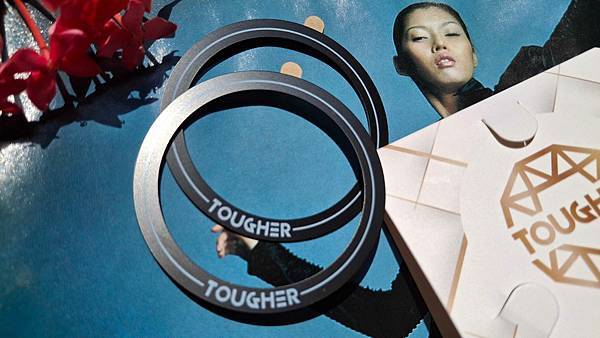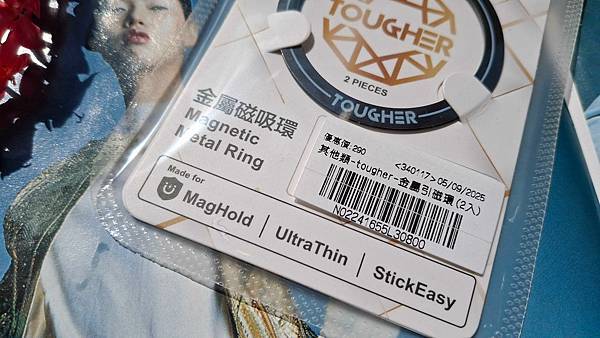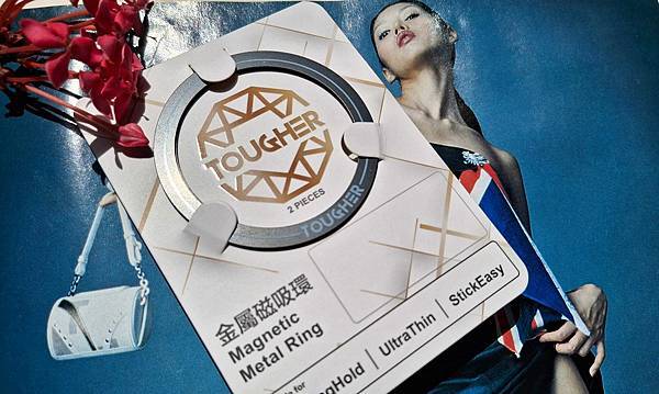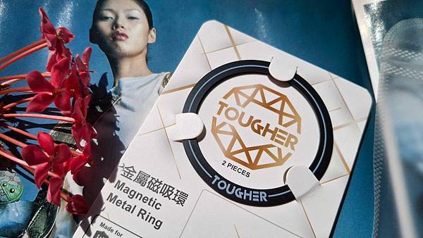 「TOUGHER」金屬磁吸環即是蘋果手機 MagSafe 磁吸擴充貼片,用於讓無線充電功能更升級。包裝整體俐落而簡約。