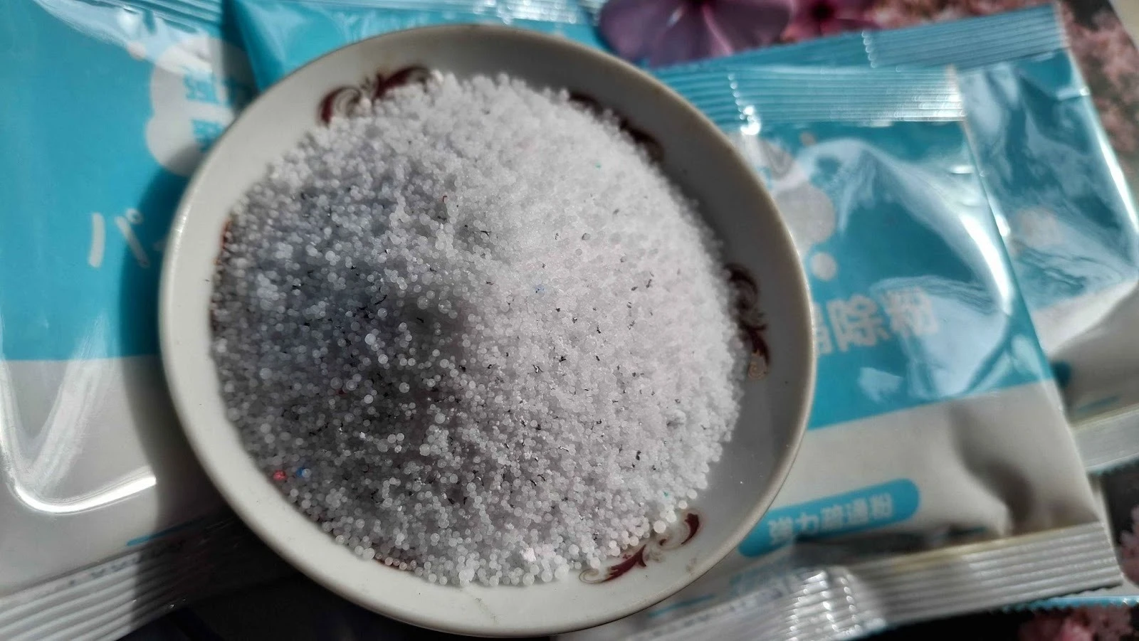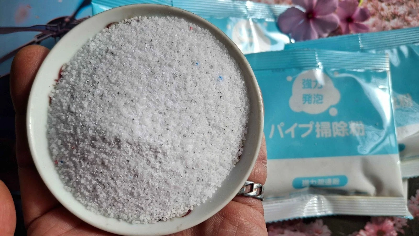 實際的疏通粉以白色的細粉末呈現、細看裡頭還有小小藍色的粒子,整體散發出一個柑橘系的味道。香香噠。
